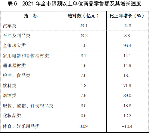 全年全市限额以上单位消费品零售额94亿元,增长16.2%。其中,限额以上单位网上零售额1.6亿元,增长17.9%。