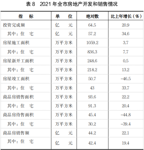 全年全市房地产开发投资64.5亿元,增长20.9%。其中,住宅投资57.2亿元,增长34.6%;商业营业用房投资3.2亿元,下降30.4%。