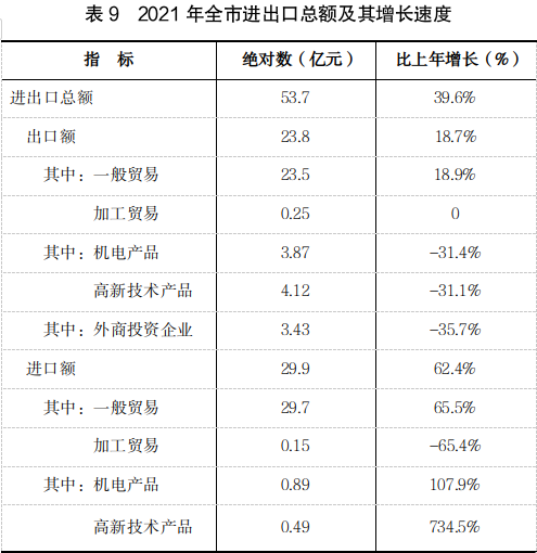 全年全市进出口总额53.7亿元,比上年增长39.6%。其中,进口额29.9亿元,增长62.4%;出口额23.8亿元,增长18.7%。