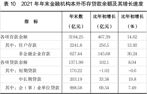 年末全市金融机构本外币各项存款余额3194.25亿元,比年初增加407.39亿元,比年初增长14.62%。各项贷款余额1371.99亿元,比年初增加102.1亿元,比年初增长8.04%。