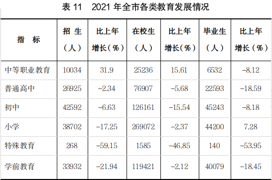 年末全市共有幼儿园793所,小学486所,普通初中210所,普通高中44所,中等职业教育学校39所,普通高等学校1所。