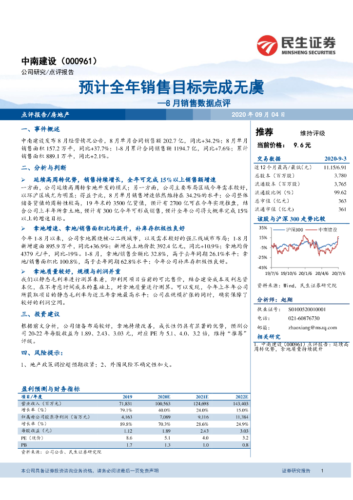 民生证券:中南建设(000961)-8月销售数据点评:预计全年销售目标完成无虞.pdf