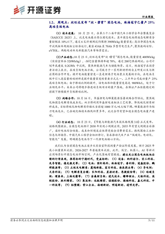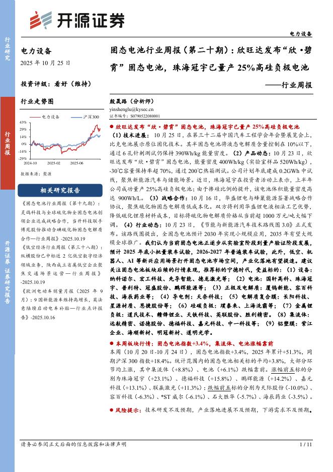 开源证券:电力设备行业固态电池行业周报(第二十期):欣旺达发布“欣·碧霄”固态电池,珠海冠宇已量产25%高硅负极电池.pdf