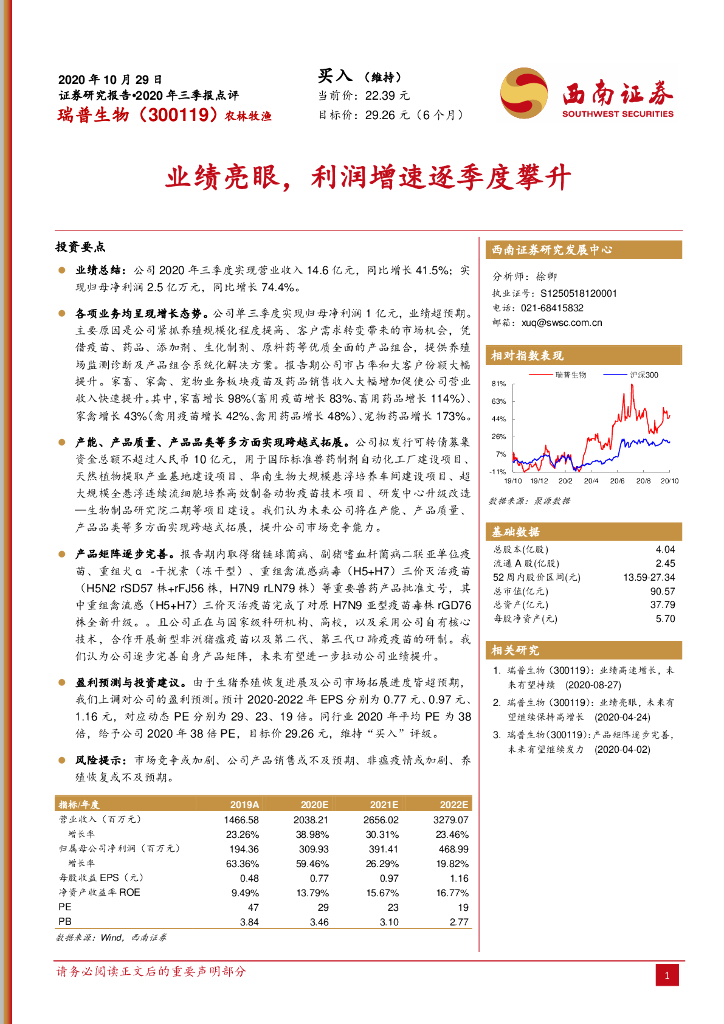 西南证券:瑞普生物(300119)-2020年三季报点评:业绩亮眼,利润增速逐季度攀升.pdf