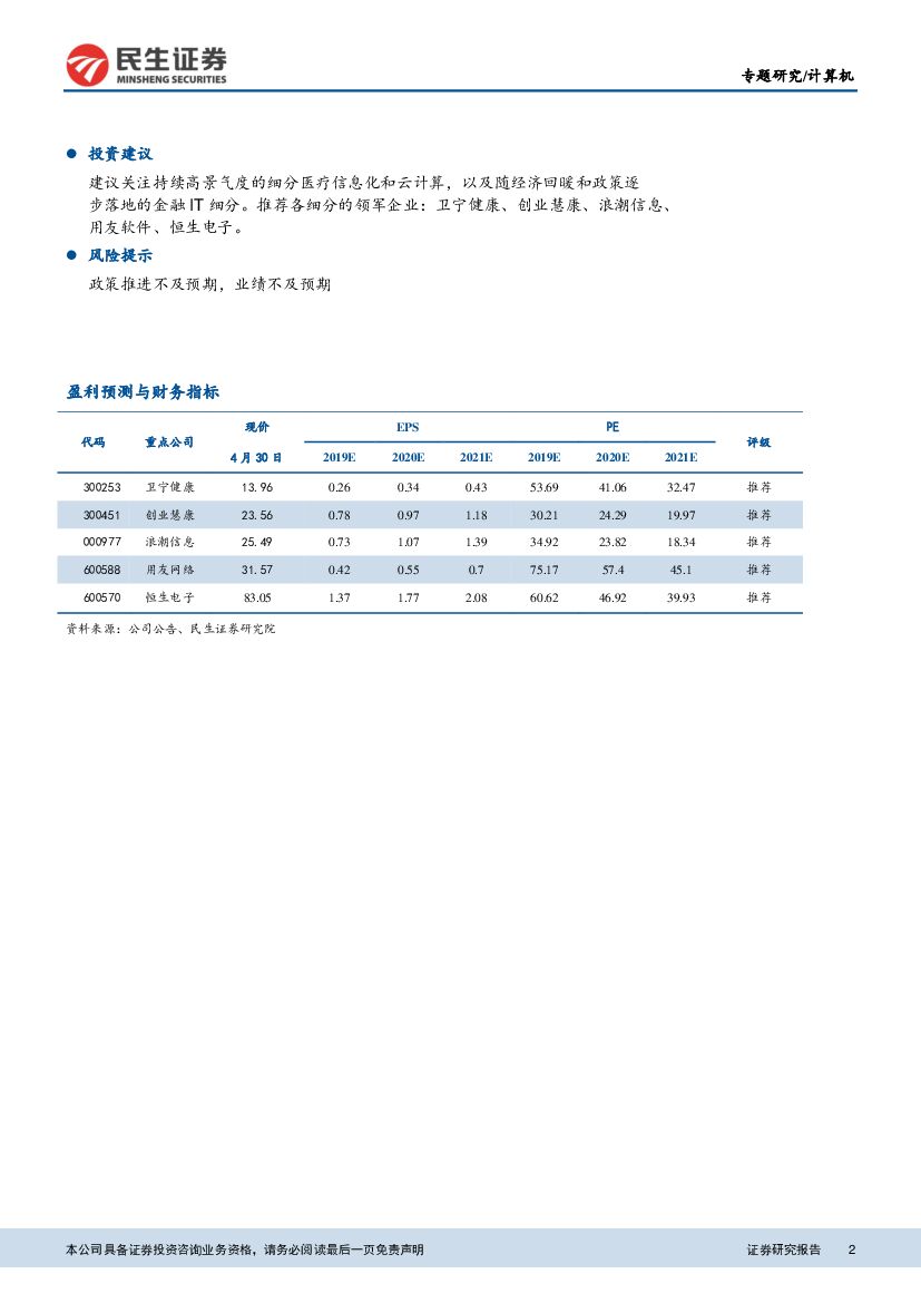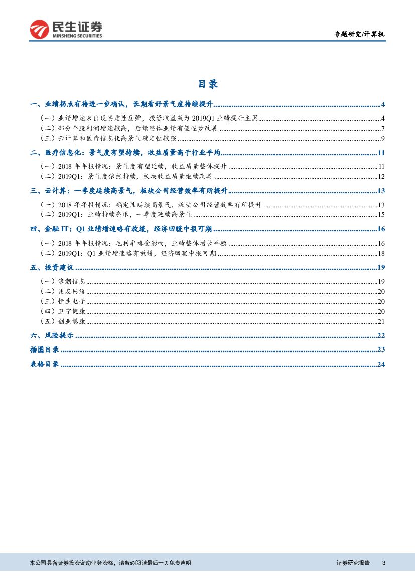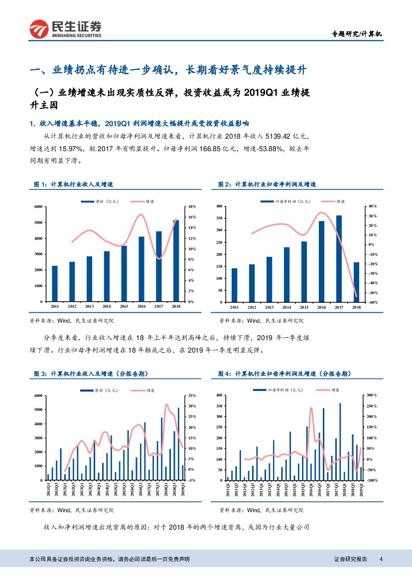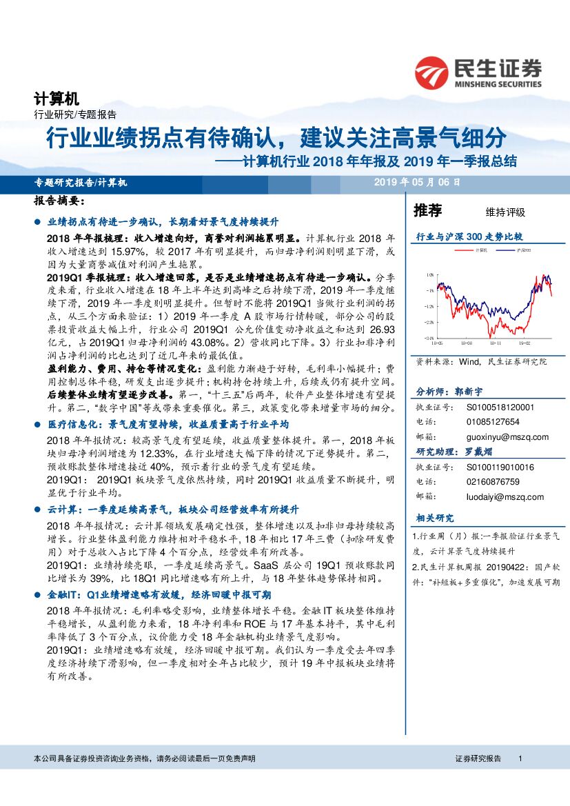 民生证券:计算机行业2018年年报及2019年一季报总结:行业业绩拐点有待确认,建议关注高景气细分.pdf