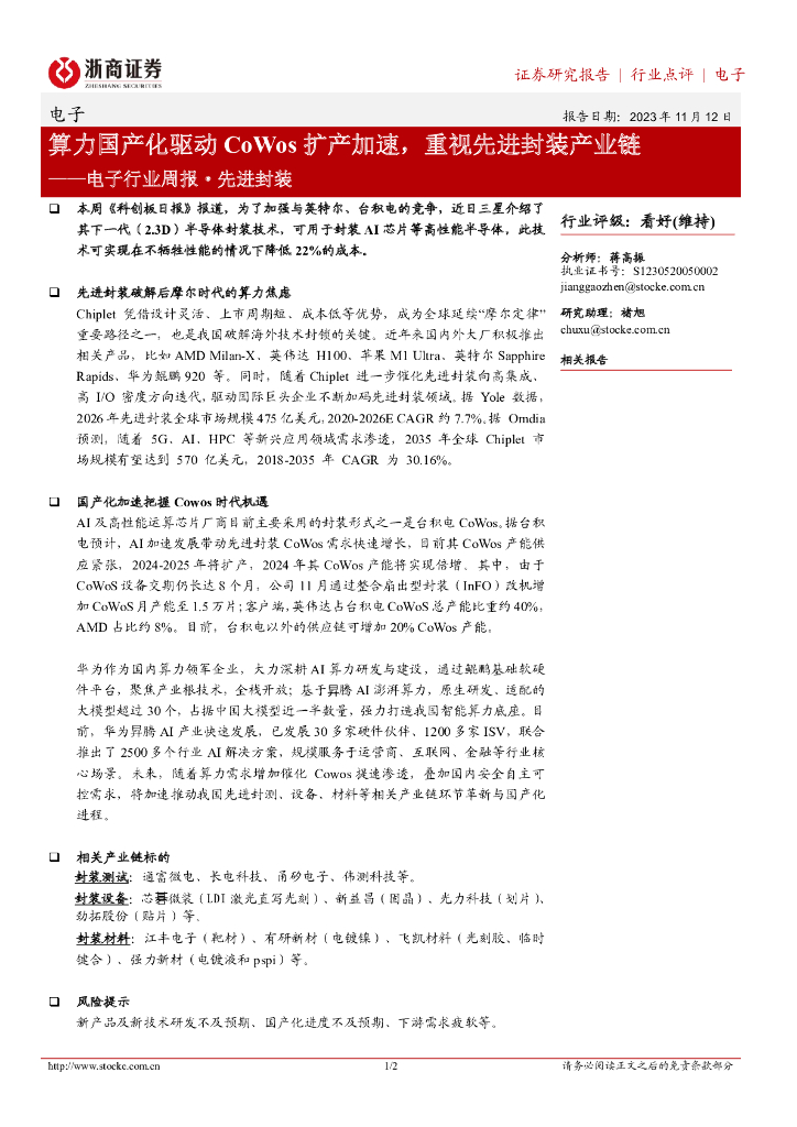 浙商证券:电子行业周报·先进封装:算力国产化驱动CoWos扩产加速,重视先进封装产业链.pdf
