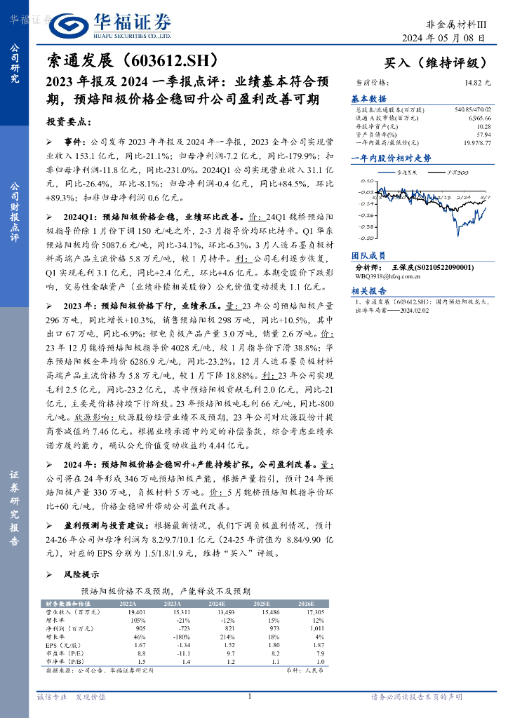 华福证券:索通发展(603612)-2023年报及2024一季报点评:业绩基本符合预期,预焙阳极价格企稳回升公司盈利改善可期.pdf