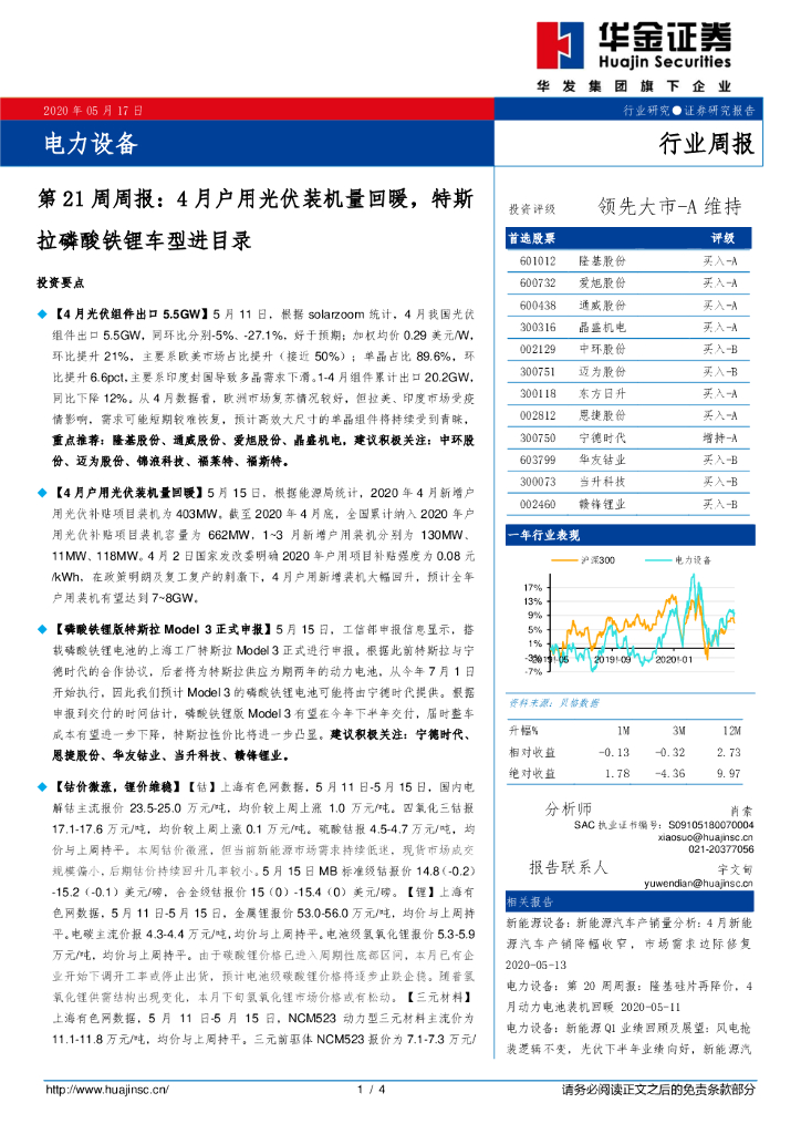 华金证券:电力设备第21周周报:4月户用光伏装机量回暖,特斯拉磷酸铁锂车型进目录.pdf