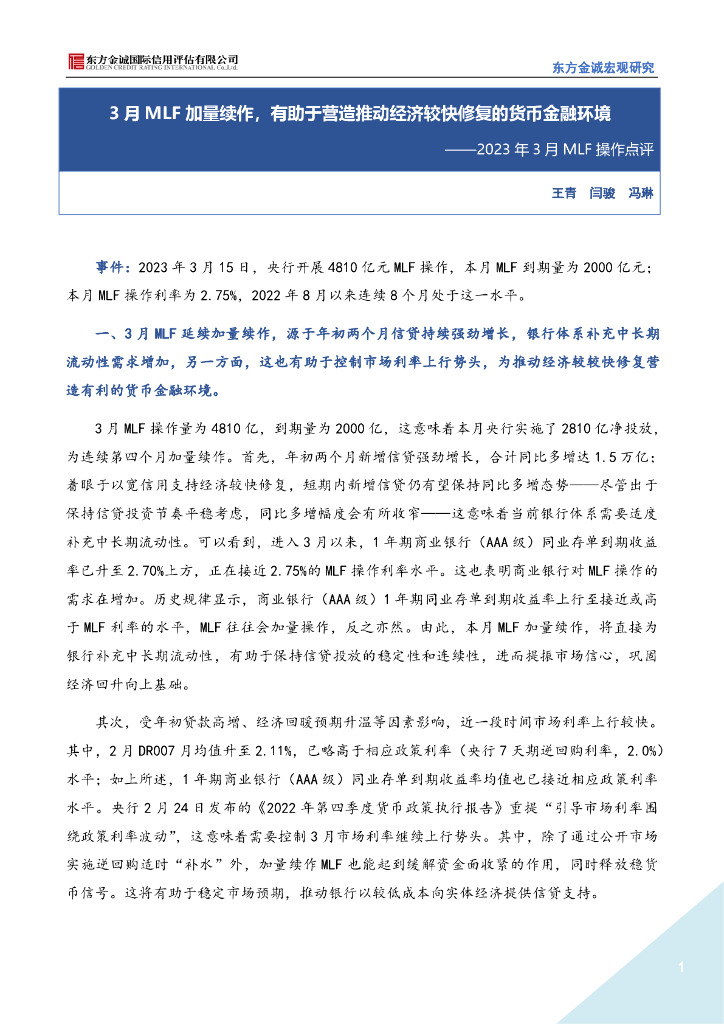 东方金诚:3月MLF操作点评-3月MLF加量续作,有助于营造推动经济较快修复的货币金融环境.pdf