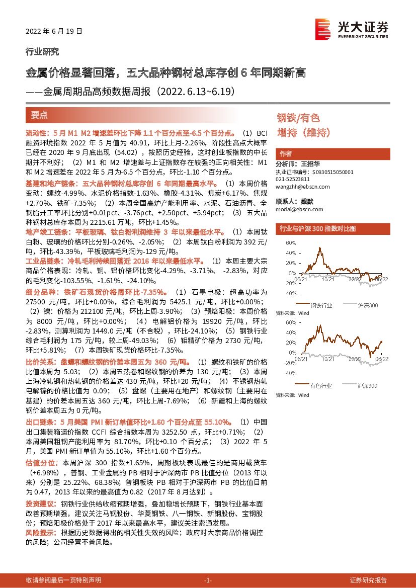 光大证券:金属周期品高频数据周报:金属价格显著回落,五大品种钢材总库存创6年同期新高.pdf