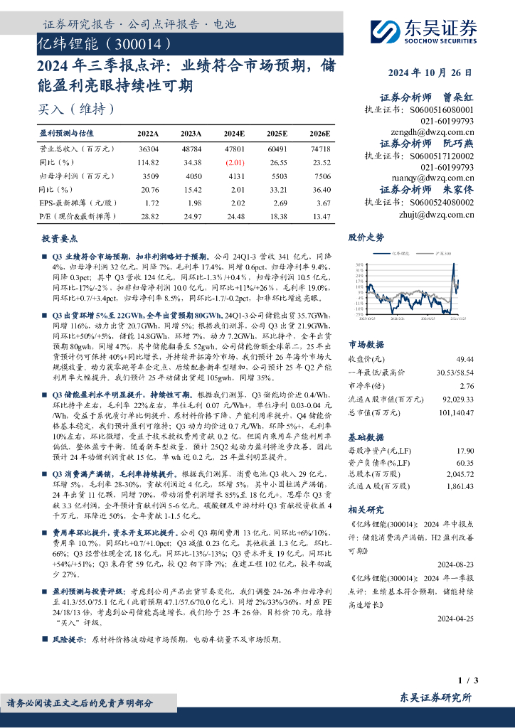 东吴证券:亿纬锂能(300014)-2024年三季报点评:业绩符合市场预期,储能盈利亮眼持续性可期.pdf