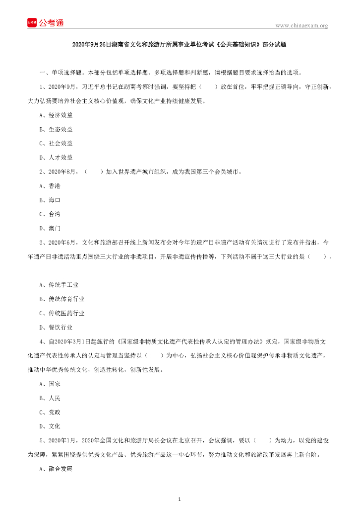 2020年9月26日湖南省文化和旅游厅所属事业单位考试《公共基础知识》部分试题 ...pdf
