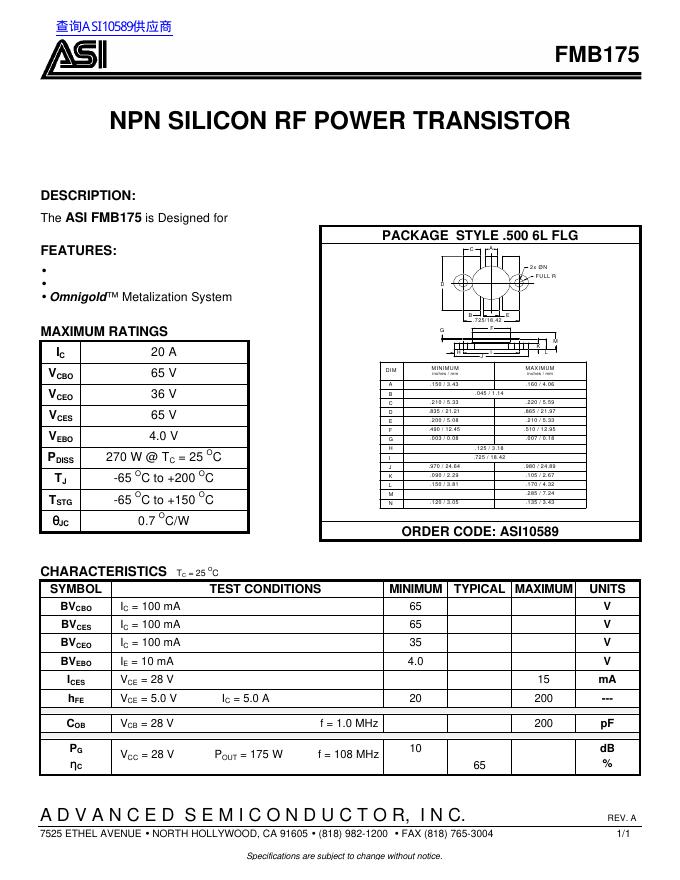 NPN SILICON RF POWER TRANSISTOR FMB175 数据手册.pdf