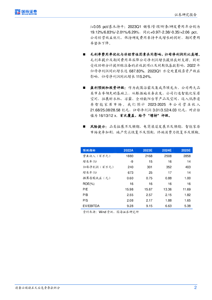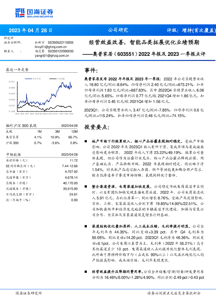 国海证券:奥普家居(603551)-2022年报及2023一季报点评:经营效益改善,智能品类拓展优化业绩预期.pdf