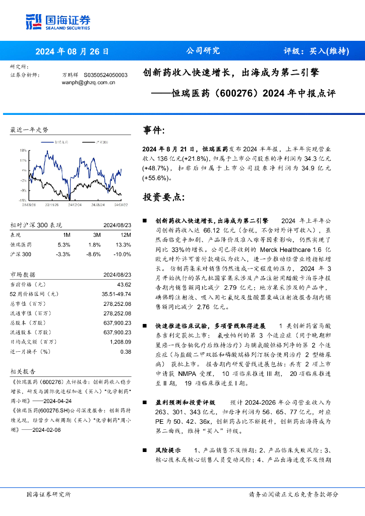 国海证券:恒瑞医药(600276)-2024年中报点评:创新药收入快速增长,出海成为第二引擎.pdf