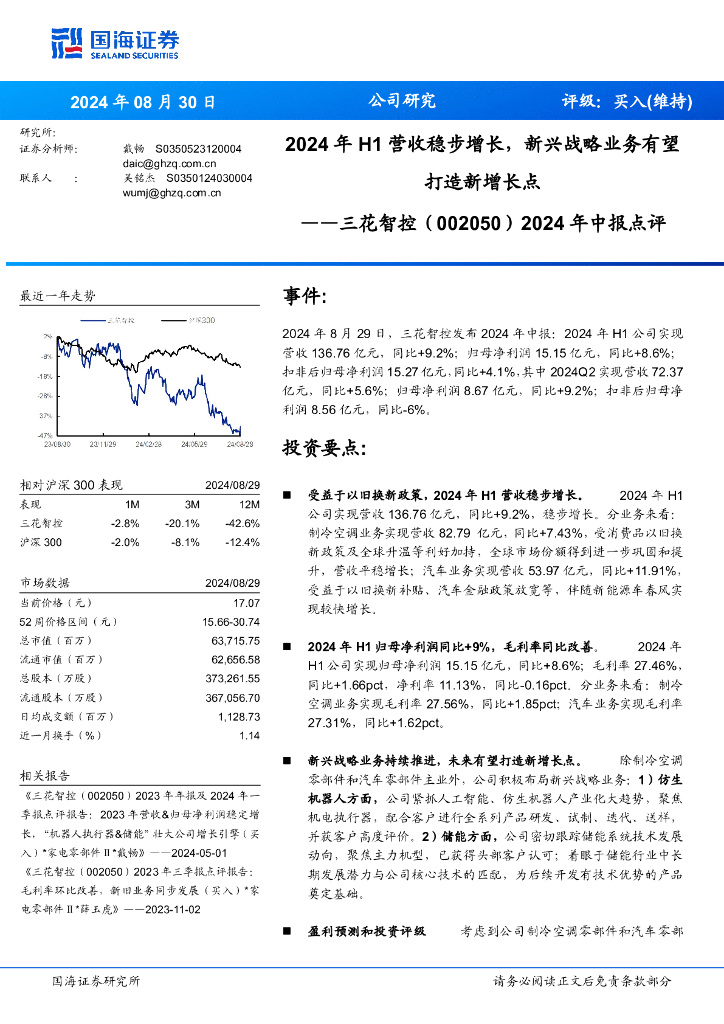 国海证券:三花智控(002050)-2024年中报点评:2024年H1营收稳步增长,新兴战略业务有望打造新增长点.pdf