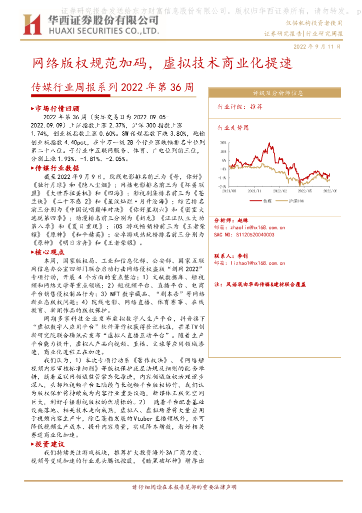 华西证券:传媒行业周报系列2022年第36周:网络版权规范加码,虚拟技术商业化提速.pdf
