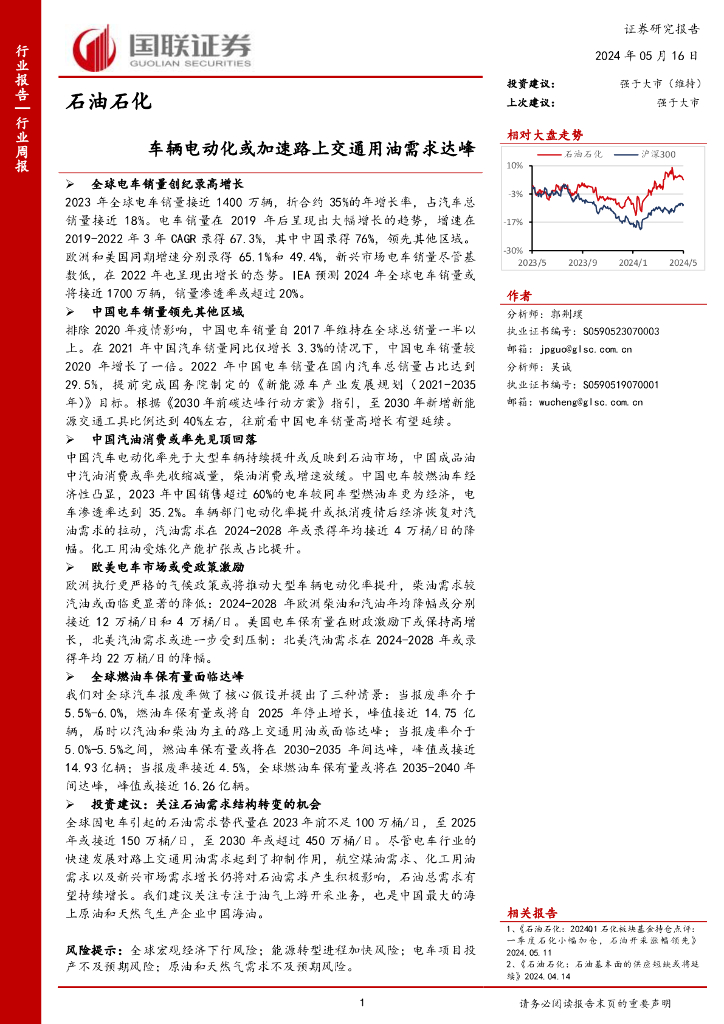 国联证券:石油石化行业周报:车辆电动化或加速路上交通用油需求达峰.pdf