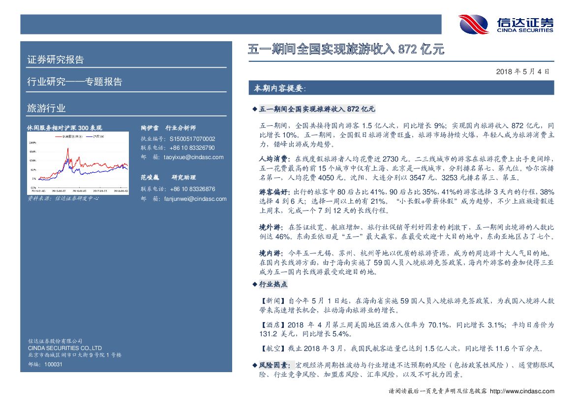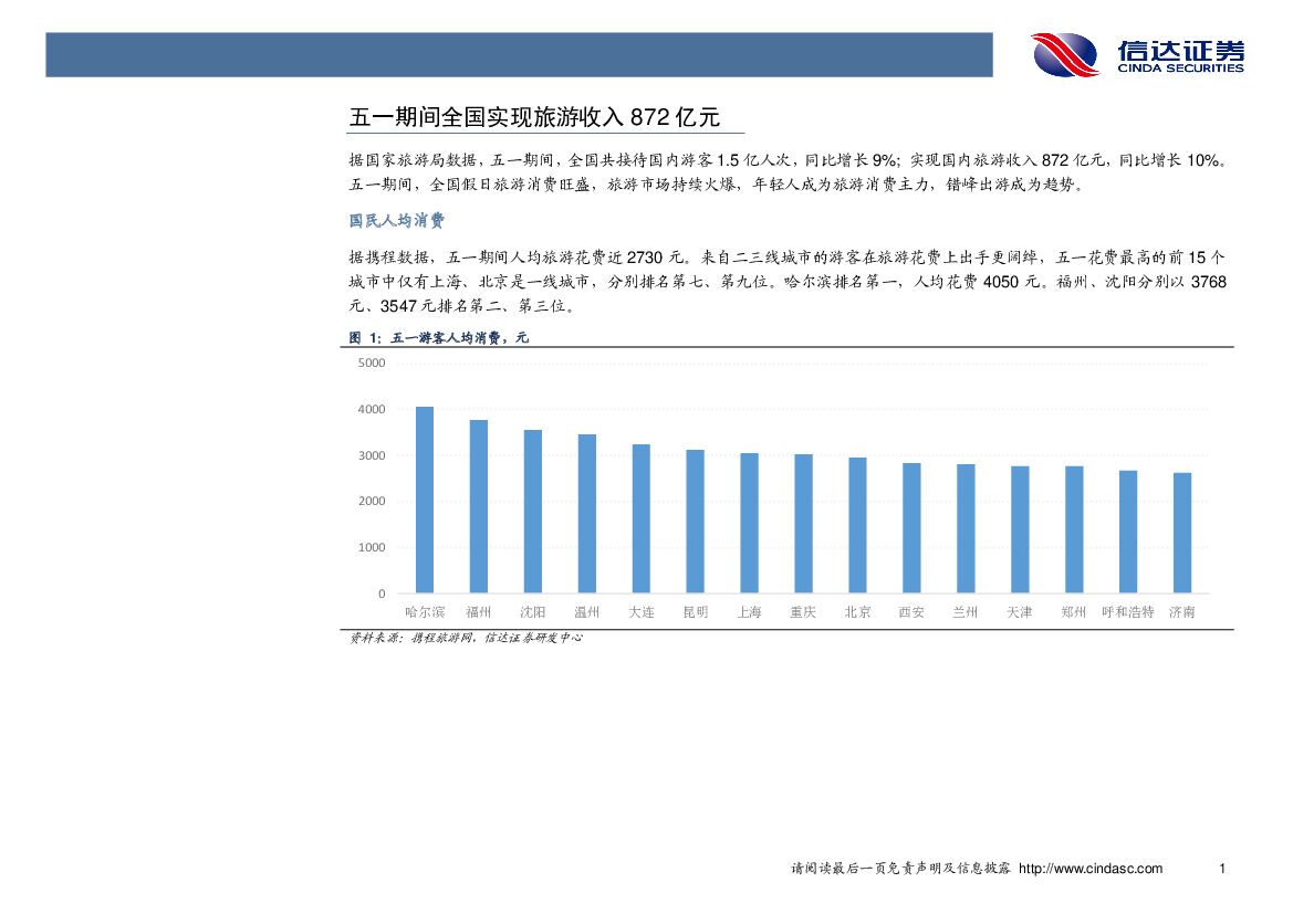 信达证券:旅游行业专题报告:五一期间全国实现旅游收入872亿元.pdf