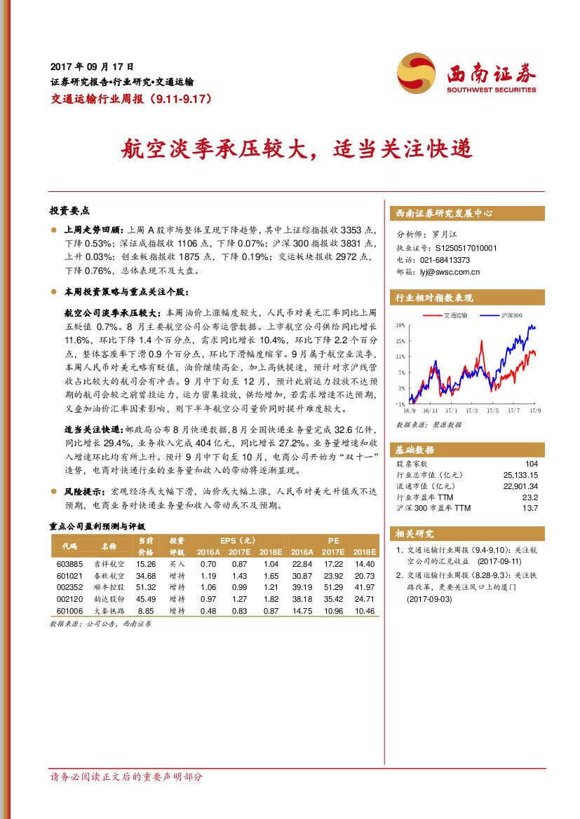 西南证券:交通运输行业周报:航空淡季承压较大,适当关注快递.pdf