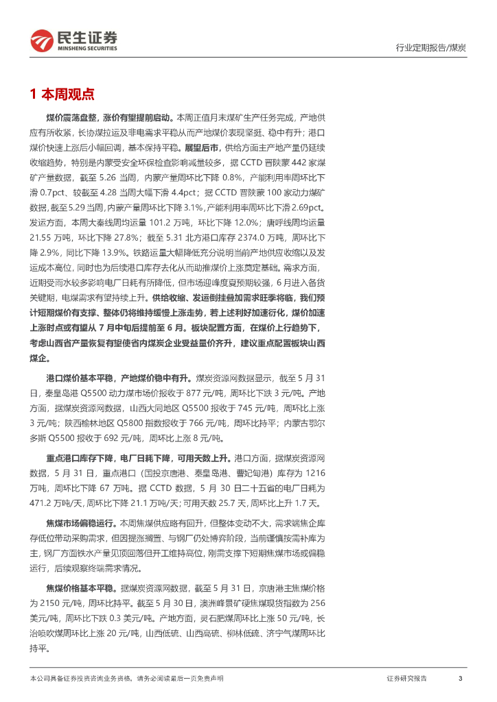 民生证券:煤炭周报:煤价震荡盘整,涨价有望提前启动.pdf