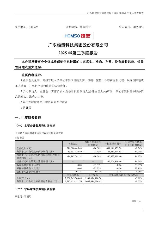 300599-雄塑科技:2025年三季度报告.pdf