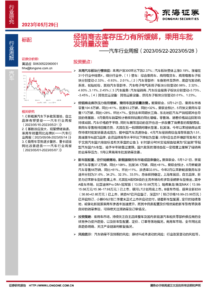 东海证券:汽车行业周报:经销商去库存压力有所缓解,乘用车批发销量改善.pdf