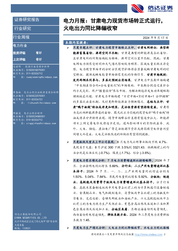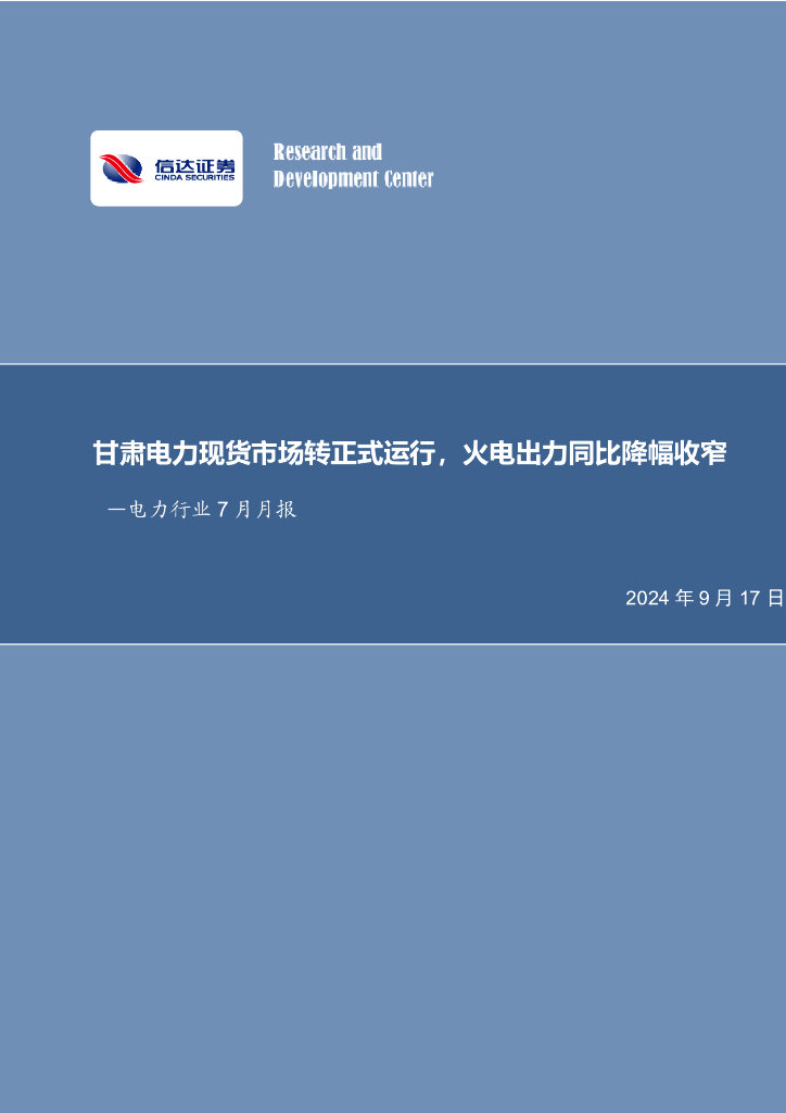信达证券:甘肃电力现货市场转正式运行,火电出力同比降幅收窄—电力行业7月月报.pdf