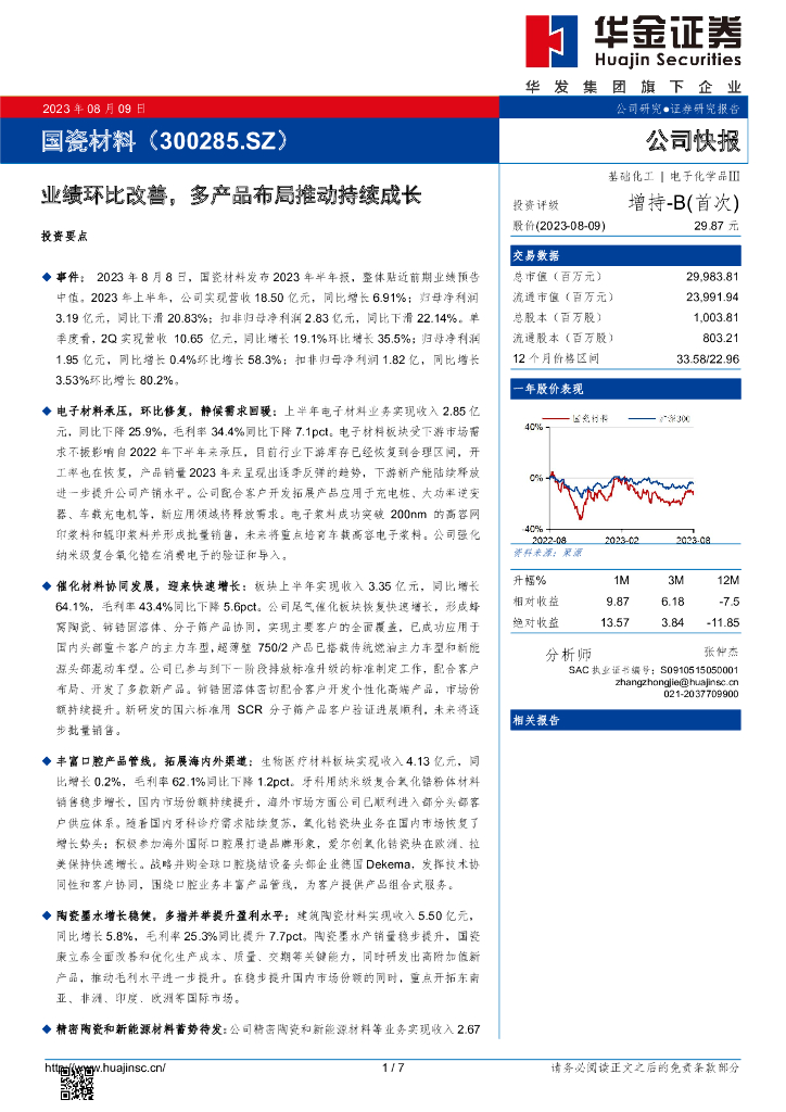 华金证券:国瓷材料(300285)-业绩环比改善,多产品布局推动持续成长.pdf