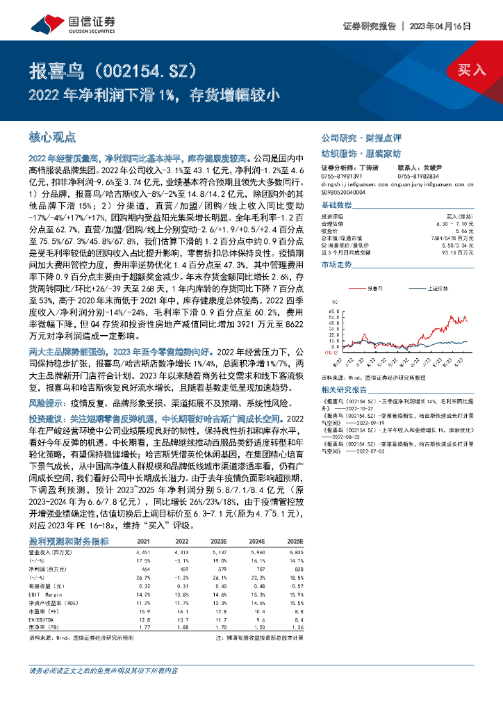国信证券:报喜鸟(002154)-2022年净利润下滑1%,存货增幅较小.pdf
