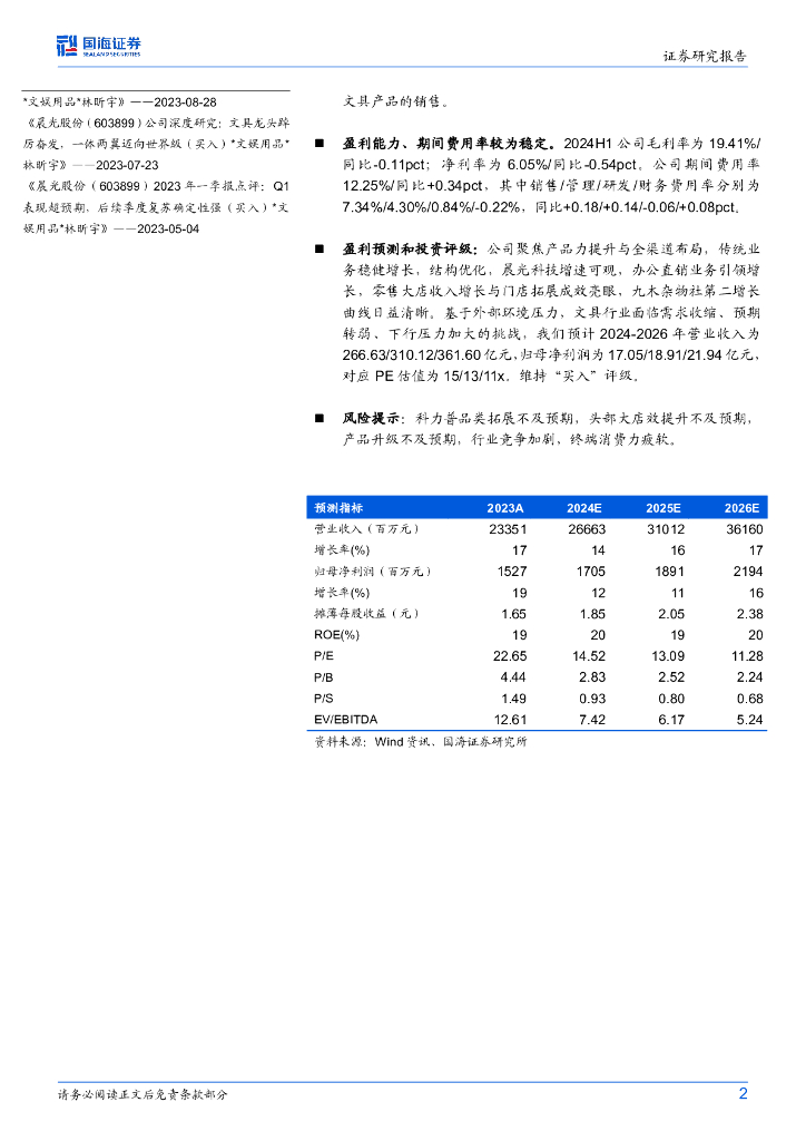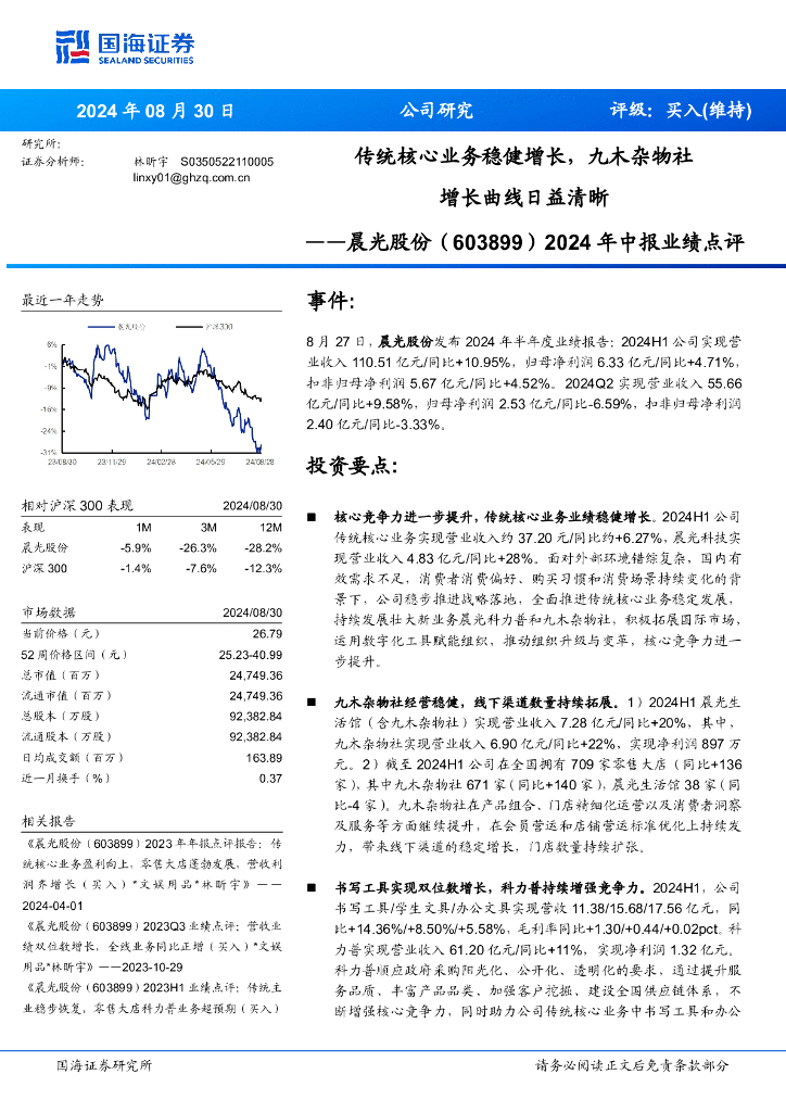国海证券:晨光股份(603899)-2024年中报业绩点评:传统核心业务稳健增长,九木杂物社增长曲线日益清晰.pdf