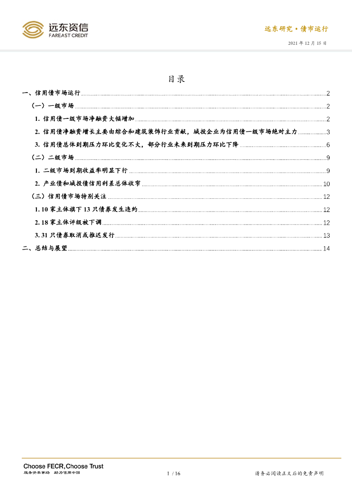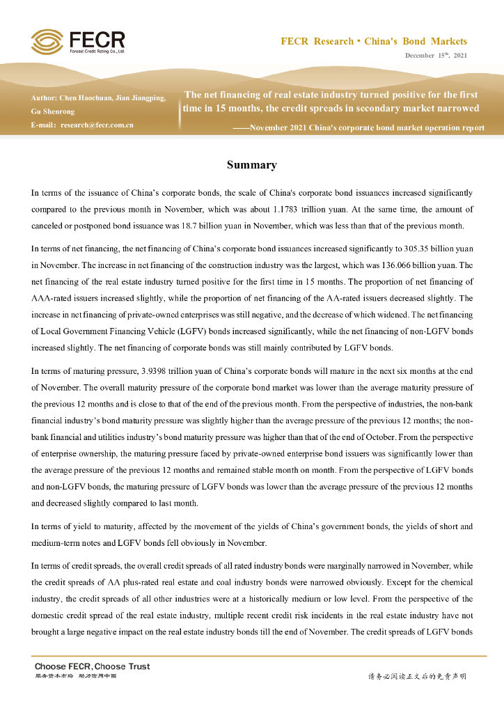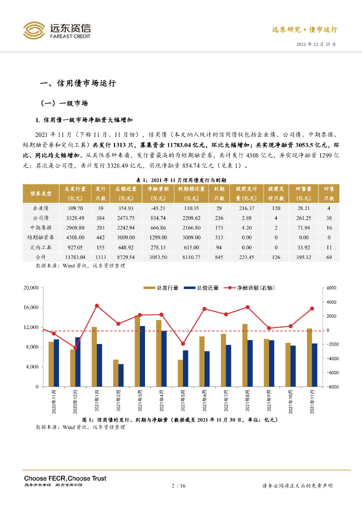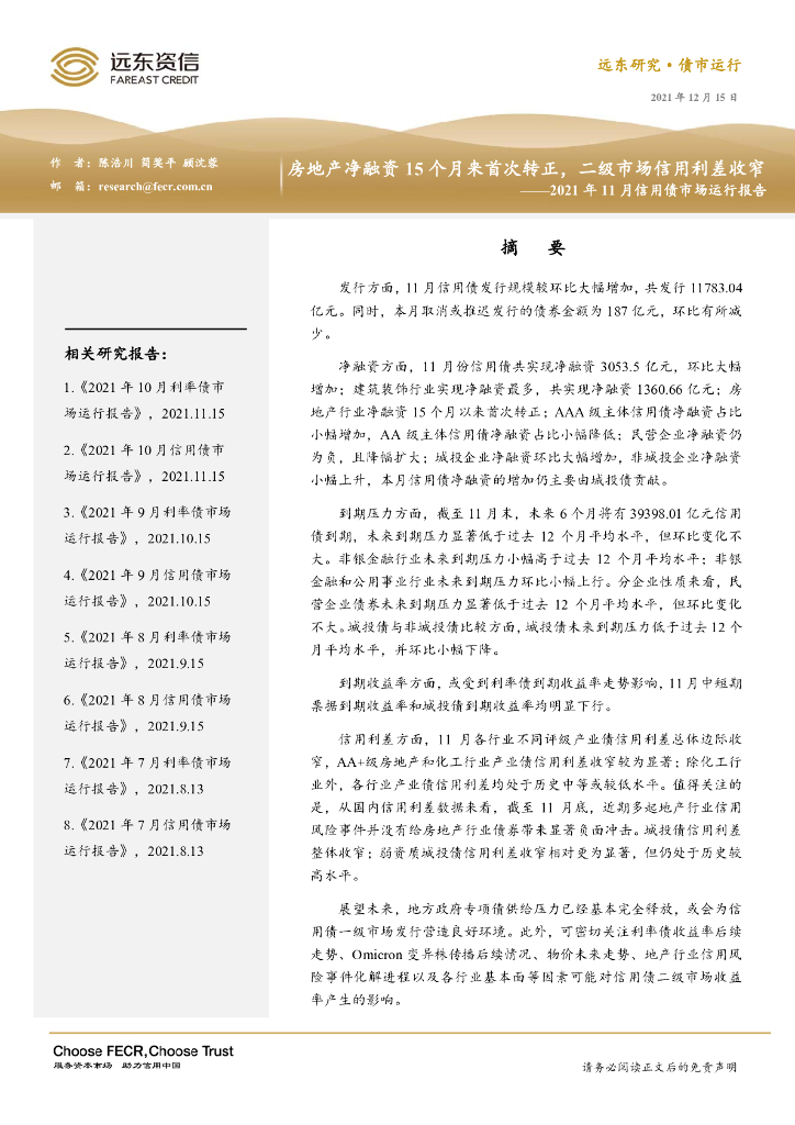 远东资信:2021年11月信用债市场运行报告:房地产净融资15个月来首次转正,二级市场信用利差收窄.pdf