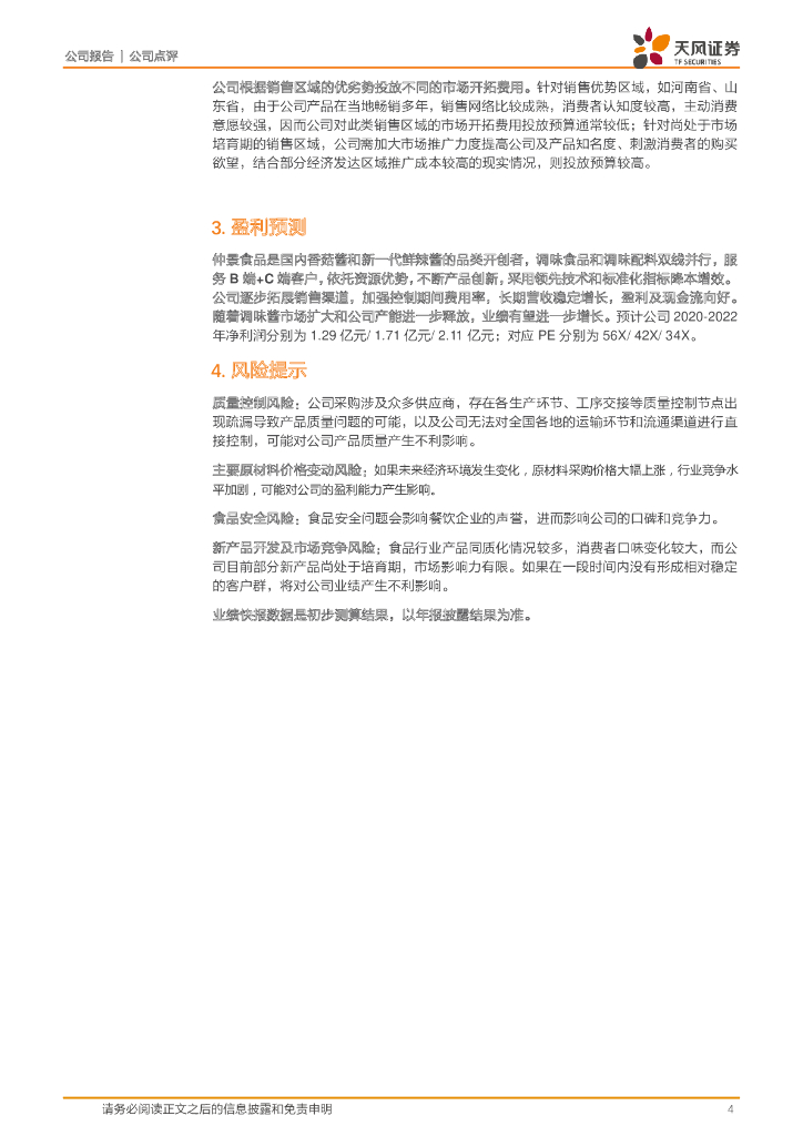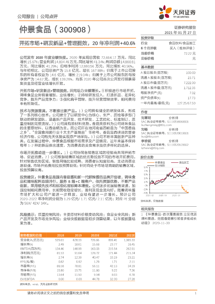 天风证券:仲景食品(300908)-开拓市场+研发新品+管理提效,20年净利润+40.6%.pdf