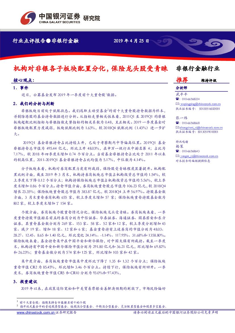 中国银河:非银行金融:机构对非银各子板块配置分化,保险龙头股受青睐.pdf