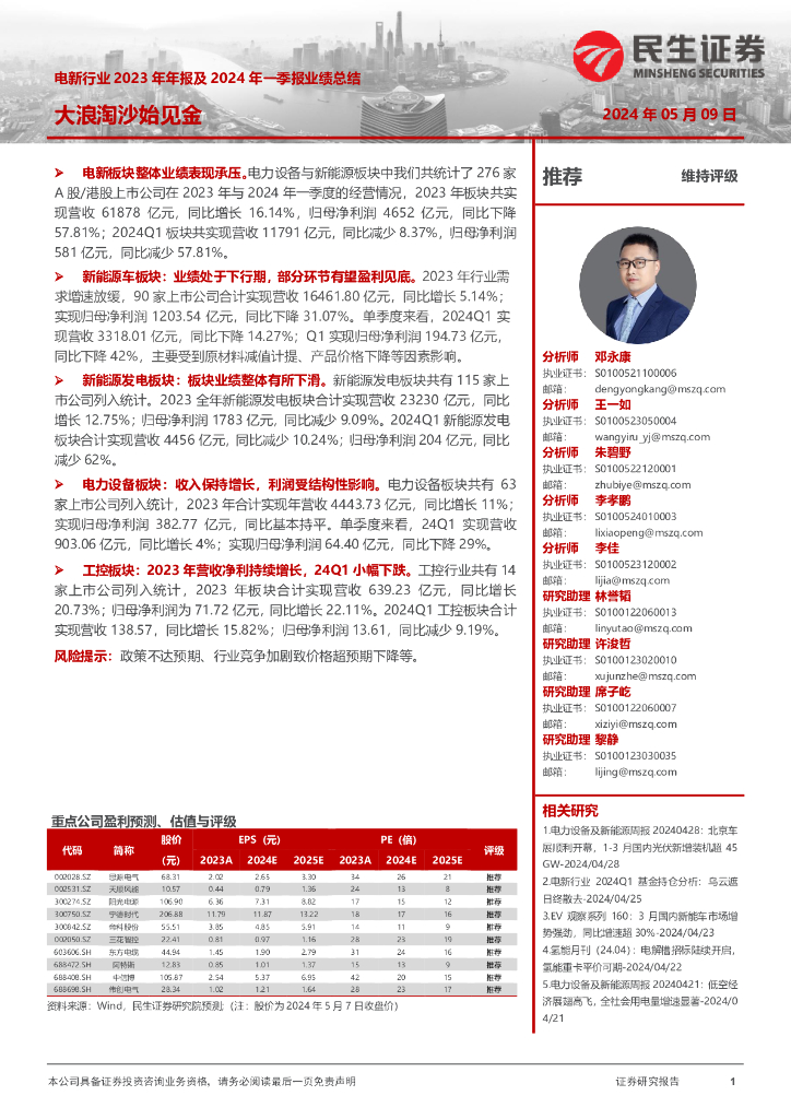民生证券:电新行业2023年年报及2024年一季报业绩总结:大浪淘沙始见金.pdf