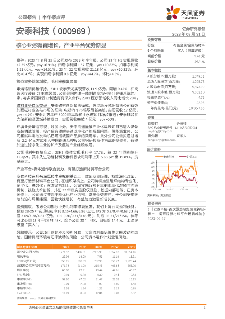 天风证券:安泰科技(000969)-核心业务稳健增长,产业平台优势渐显.pdf