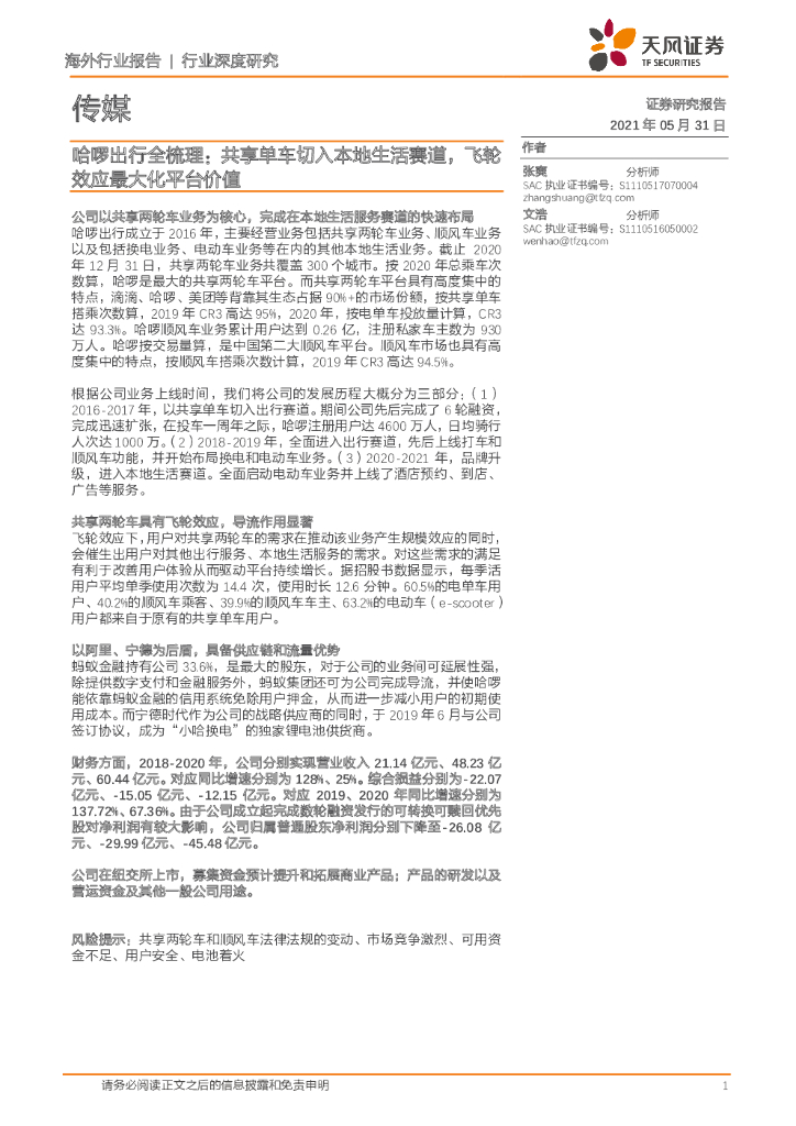 天风证券:传媒行业深度研究:哈啰出行全梳理:共享单车切入本地生活赛道,飞轮效应最大化平台价值.pdf