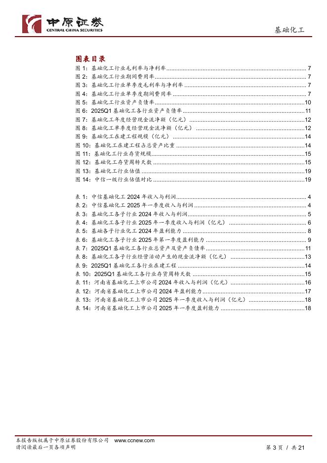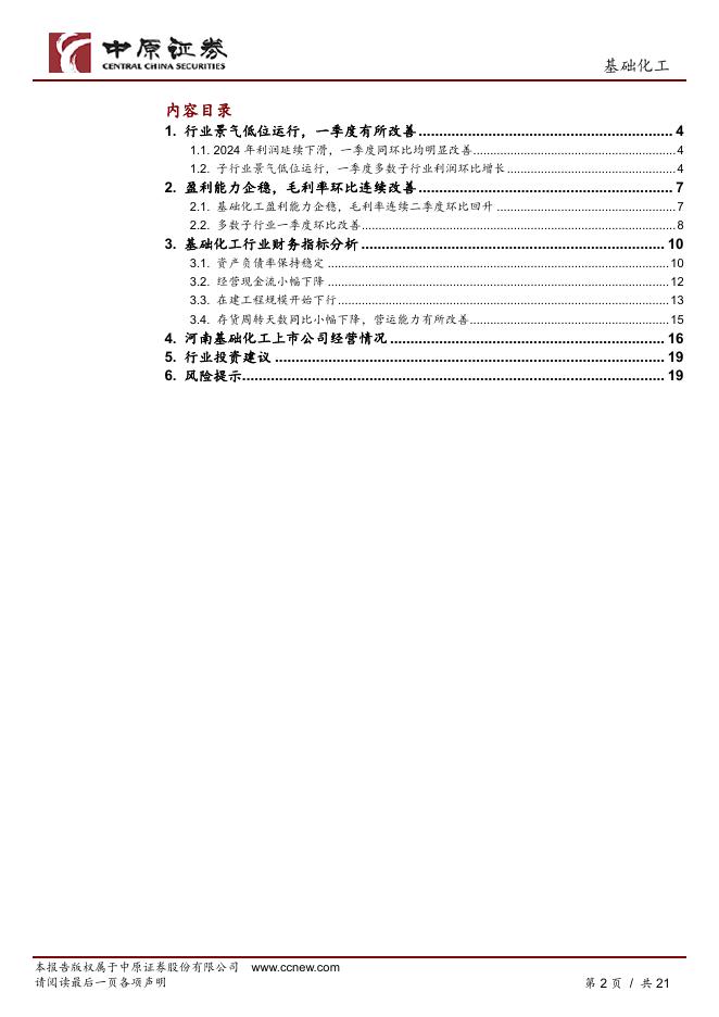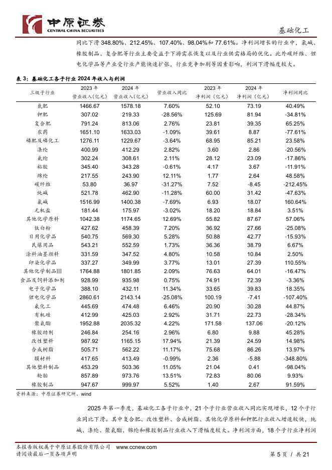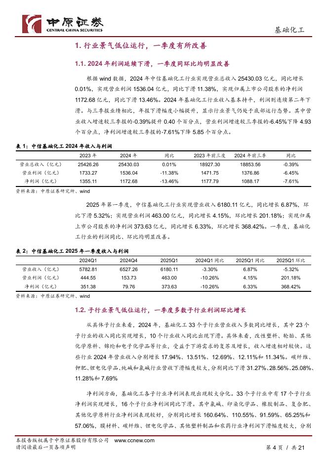 中原证券:基础化工行业2024年报及2025年一季报总结:2024年业绩延续下滑态势,2025年一季度经营明显改善.pdf
