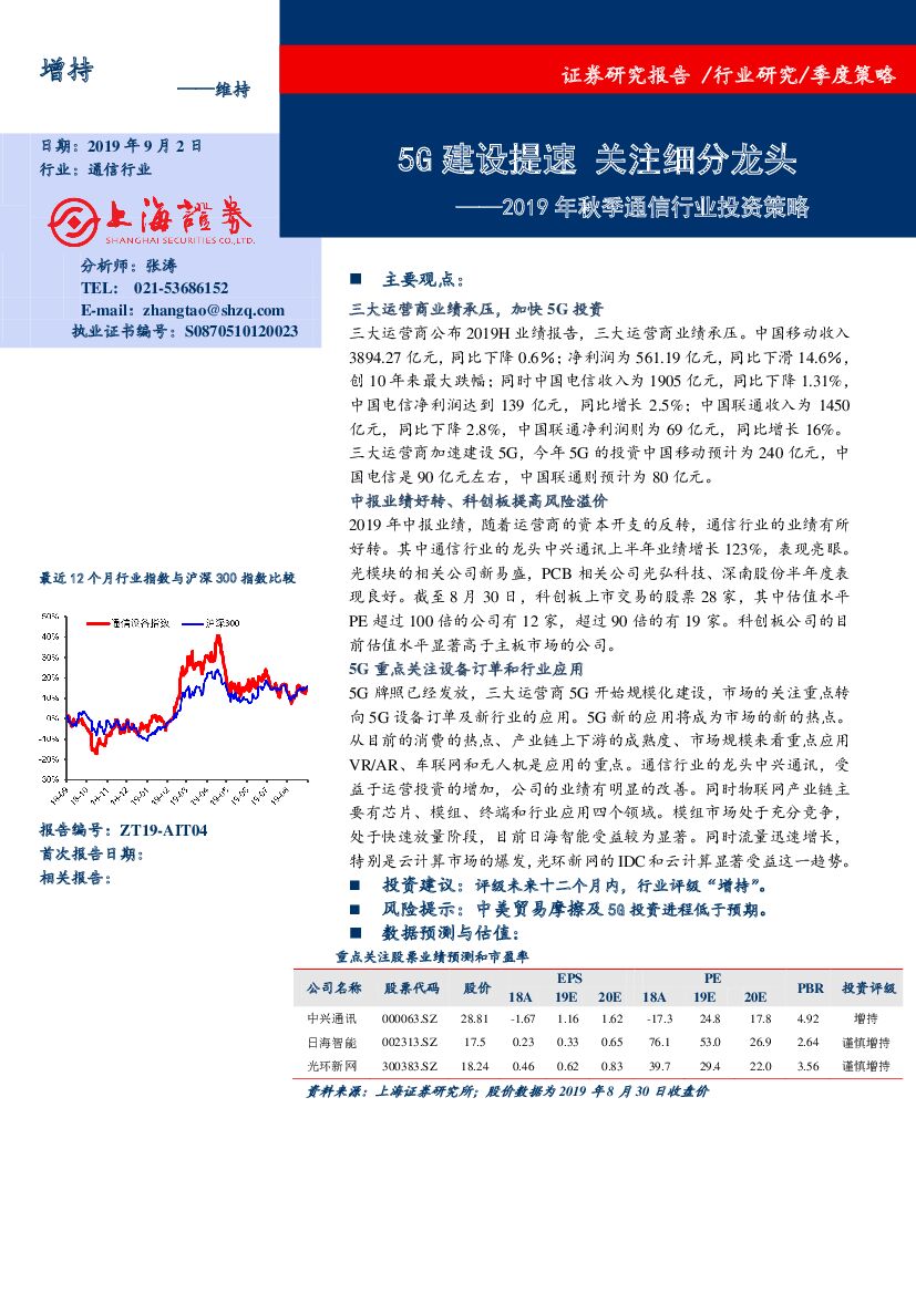 上海证券:2019年秋季通信行业投资策略:5G建设提速 关注细分龙头.pdf