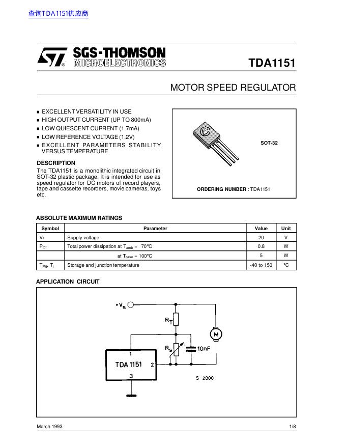 ST TDA1151 MOTOR SPEED REGULATOR 数据手册.pdf