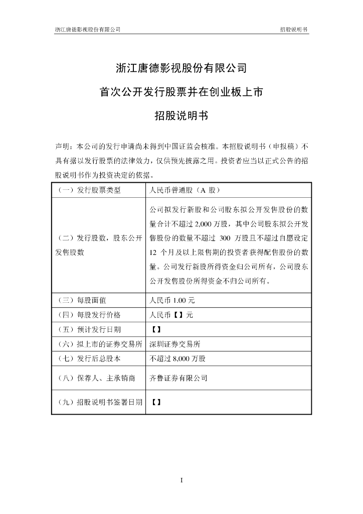 浙江唐德影视股份有限公司深交所创业板IPO上市招股说明书.pdf