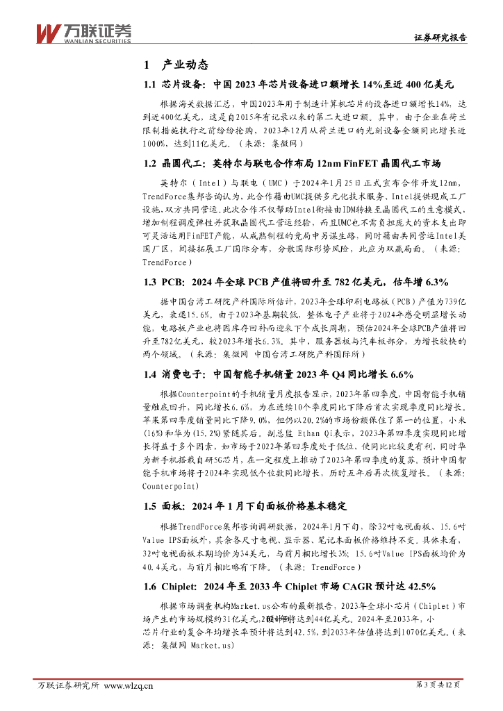 万联证券:电子行业周观点:英特尔与联电合作布局12nm,全球PCB产值有望回升.pdf
