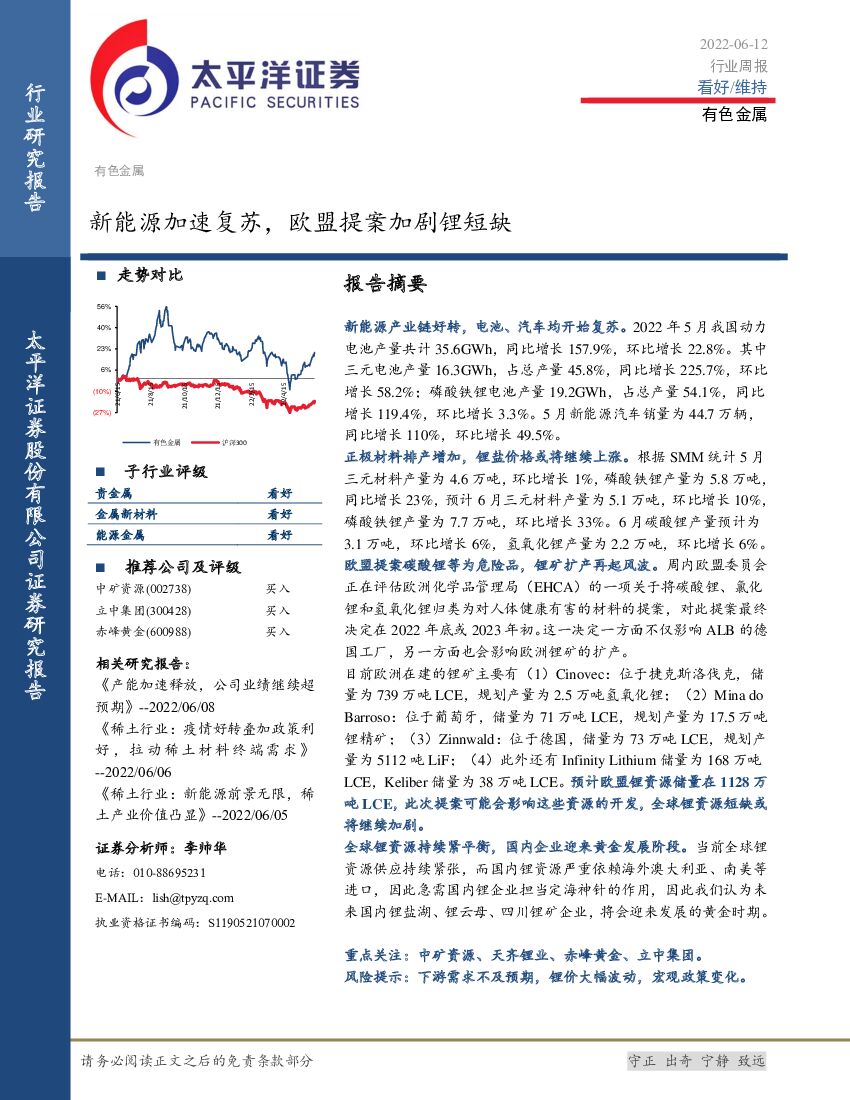 太平洋证券:有色金属行业周报:新能源加速复苏,欧盟提案加剧锂短缺.pdf