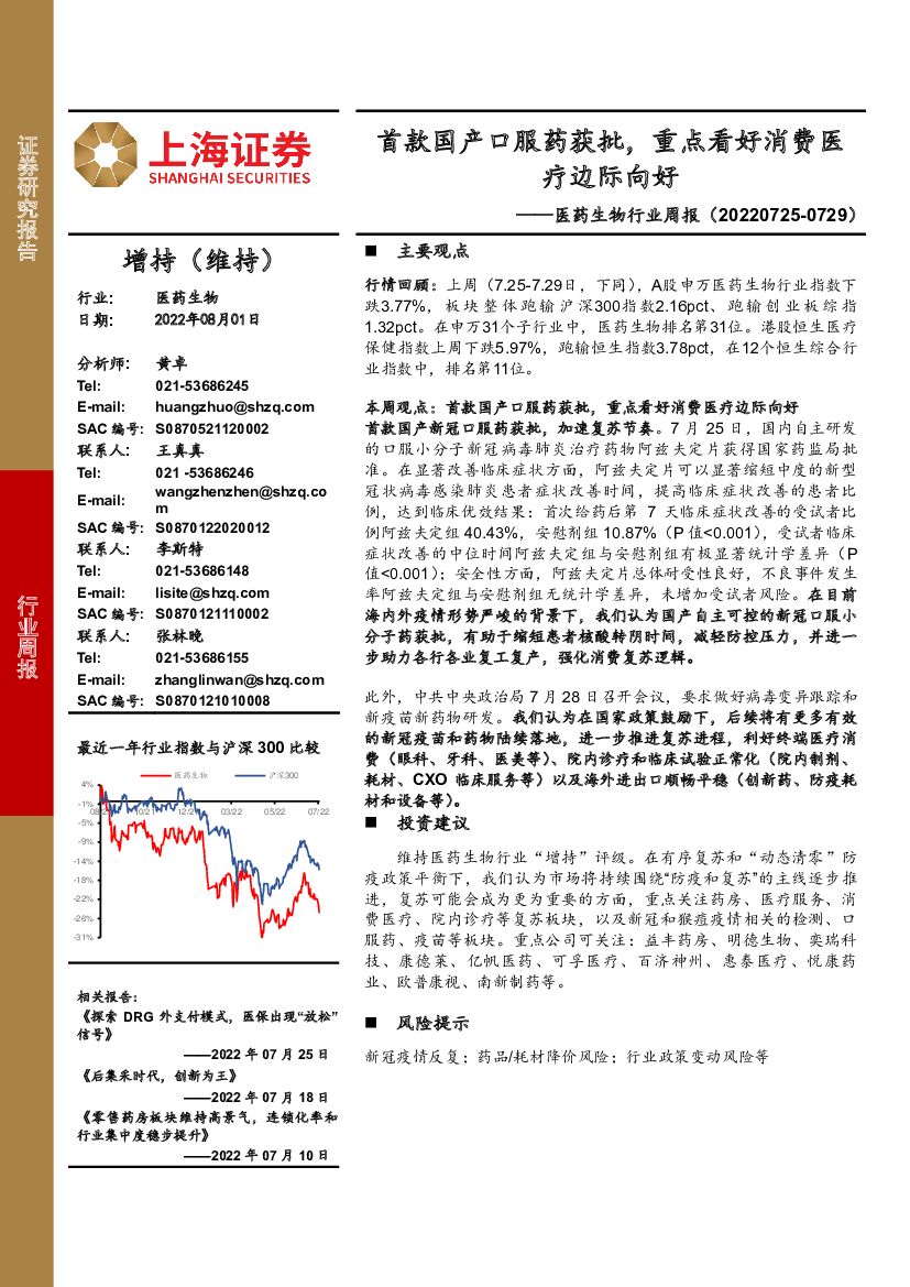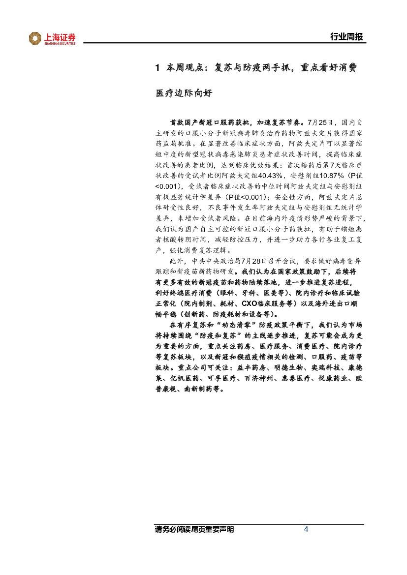 上海证券:医药生物行业周报:首款国产口服药获批,重点看好消费医疗边际向好.pdf