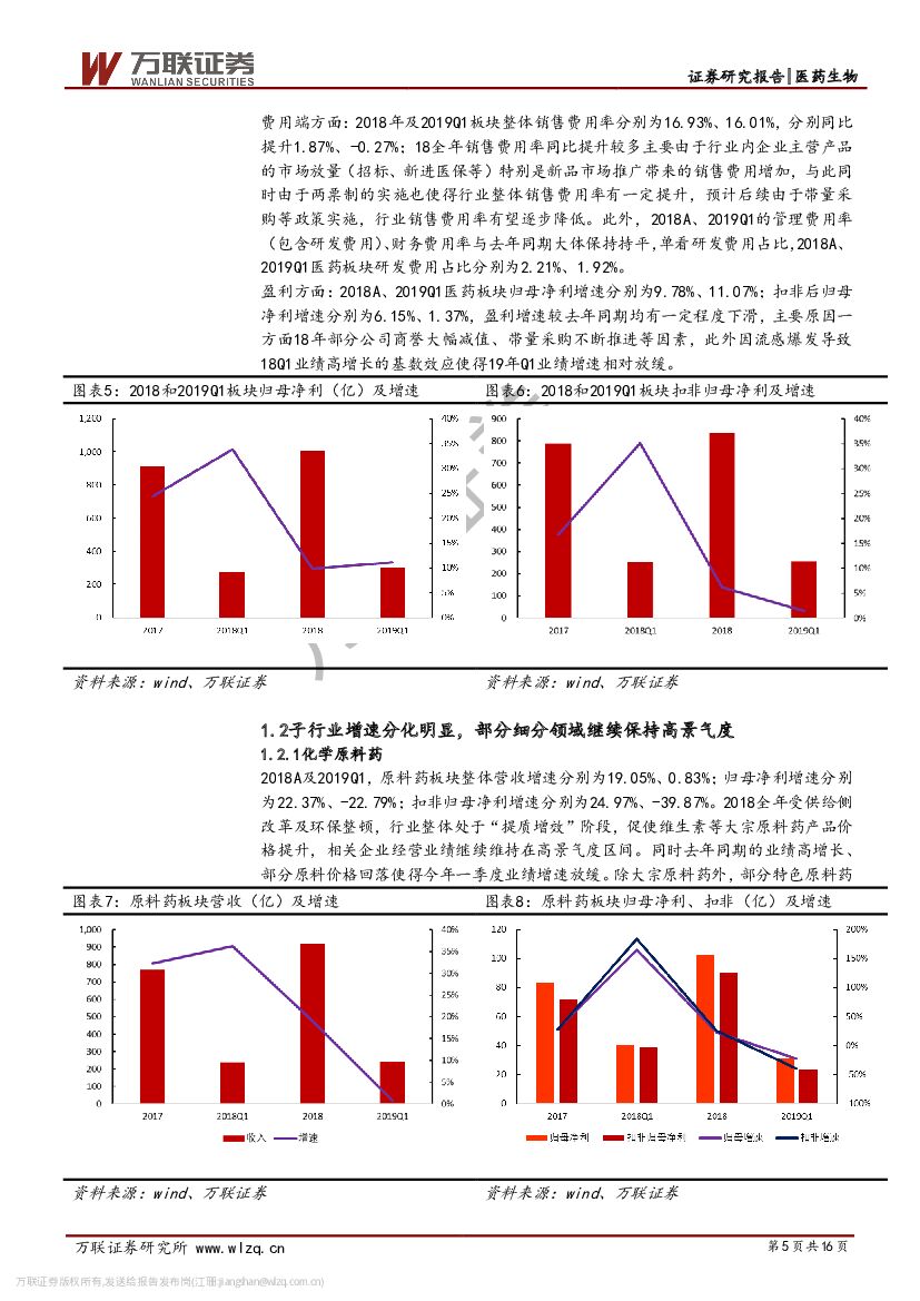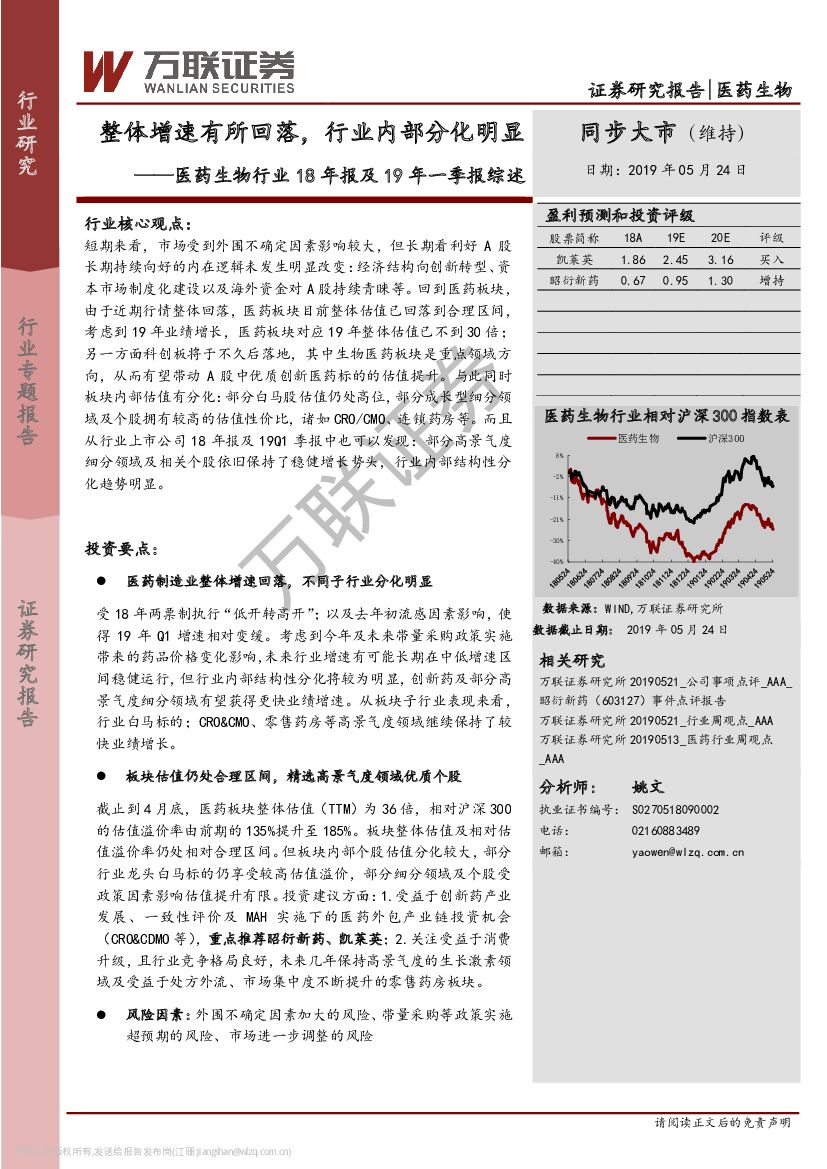 万联证券:医药生物行业18年报及19年一季报综述:整体增速有所回落,行业内部分化明显.pdf