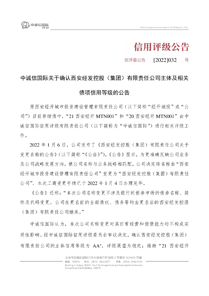 中诚信:中诚信国际关于确认西安经发控股(集团)有限责任公司主体和相关债项信用等级的公告.pdf