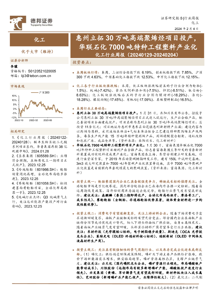 德邦证券:化工行业周报:惠州立拓30万吨高端聚烯烃项目投产,华联石化7000吨特种工程塑料产业化.pdf