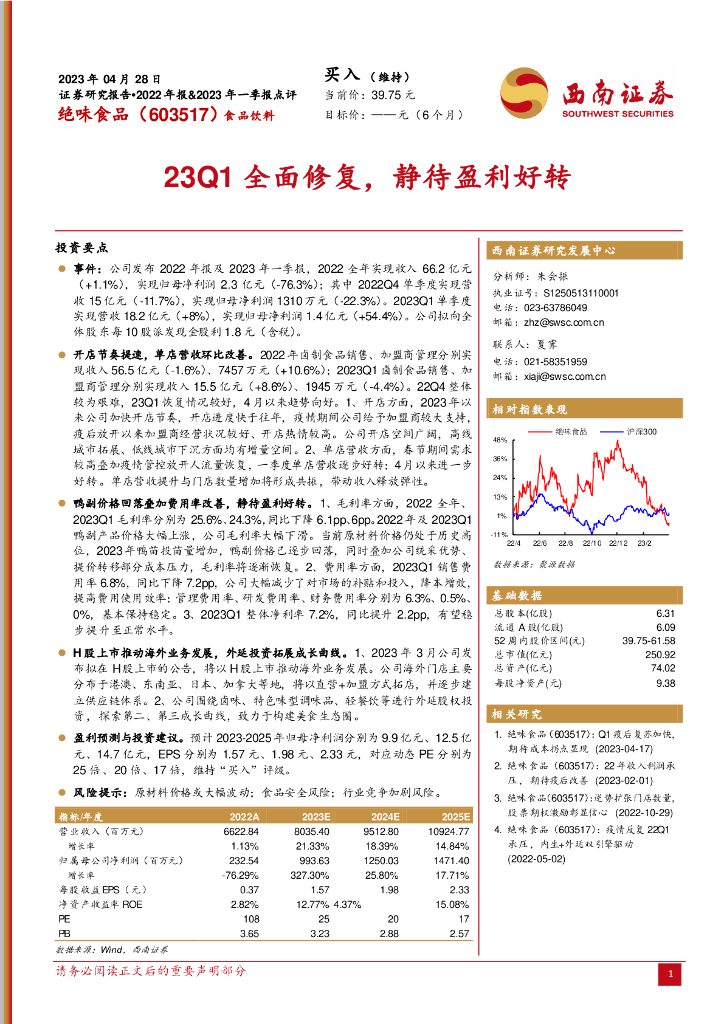 西南证券:绝味食品(603517)-23Q1全面修复,静待盈利好转.pdf