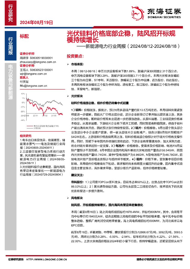 东海证券:新能源电力行业周报:光伏硅料价格底部企稳,陆风招开标规模持续增长.pdf