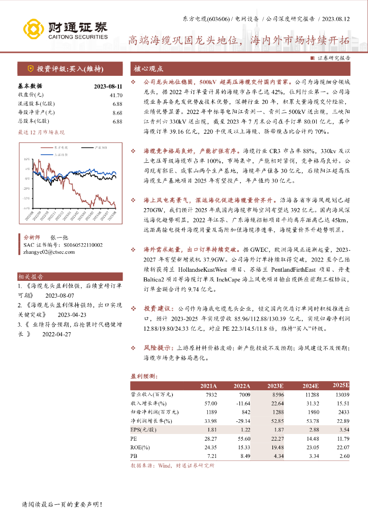财通证券:东方电缆(603606)-高端海缆巩固龙头地位,海内外市场持续开拓.pdf